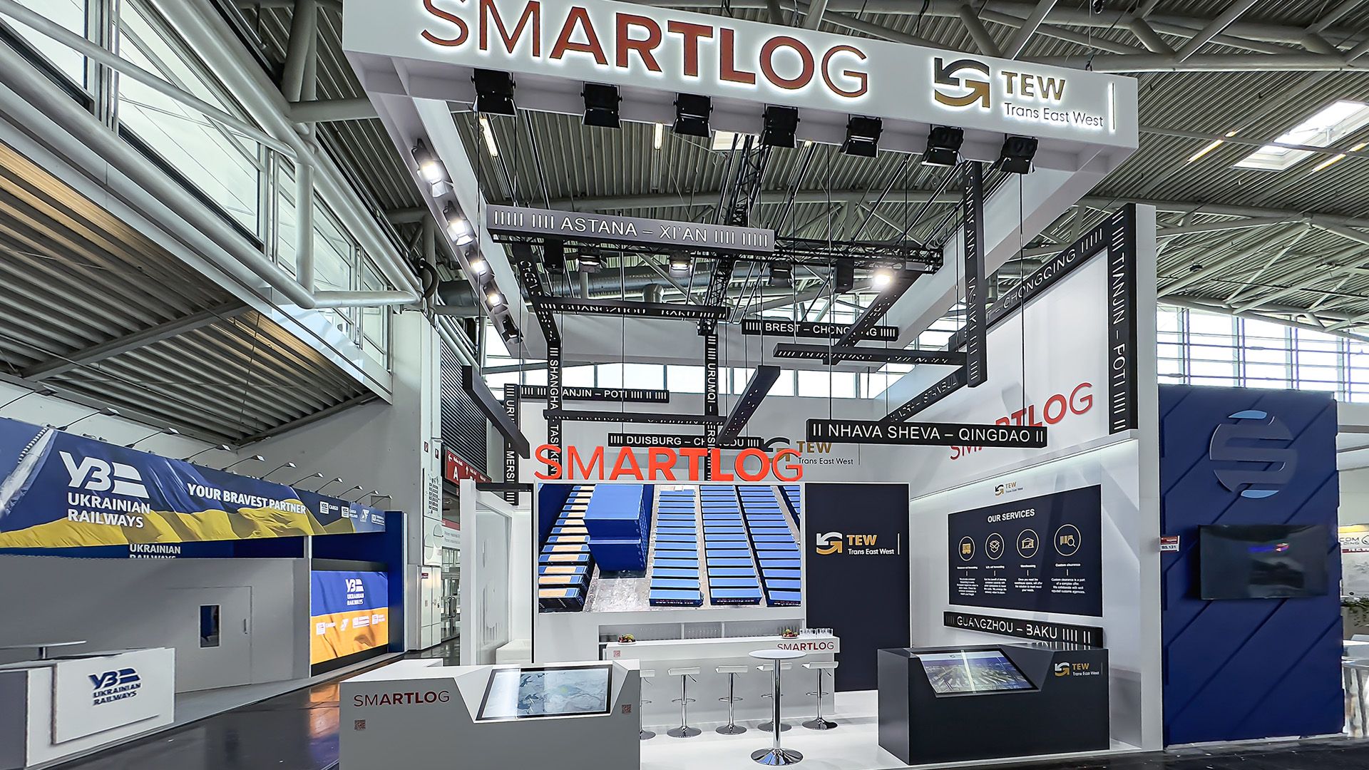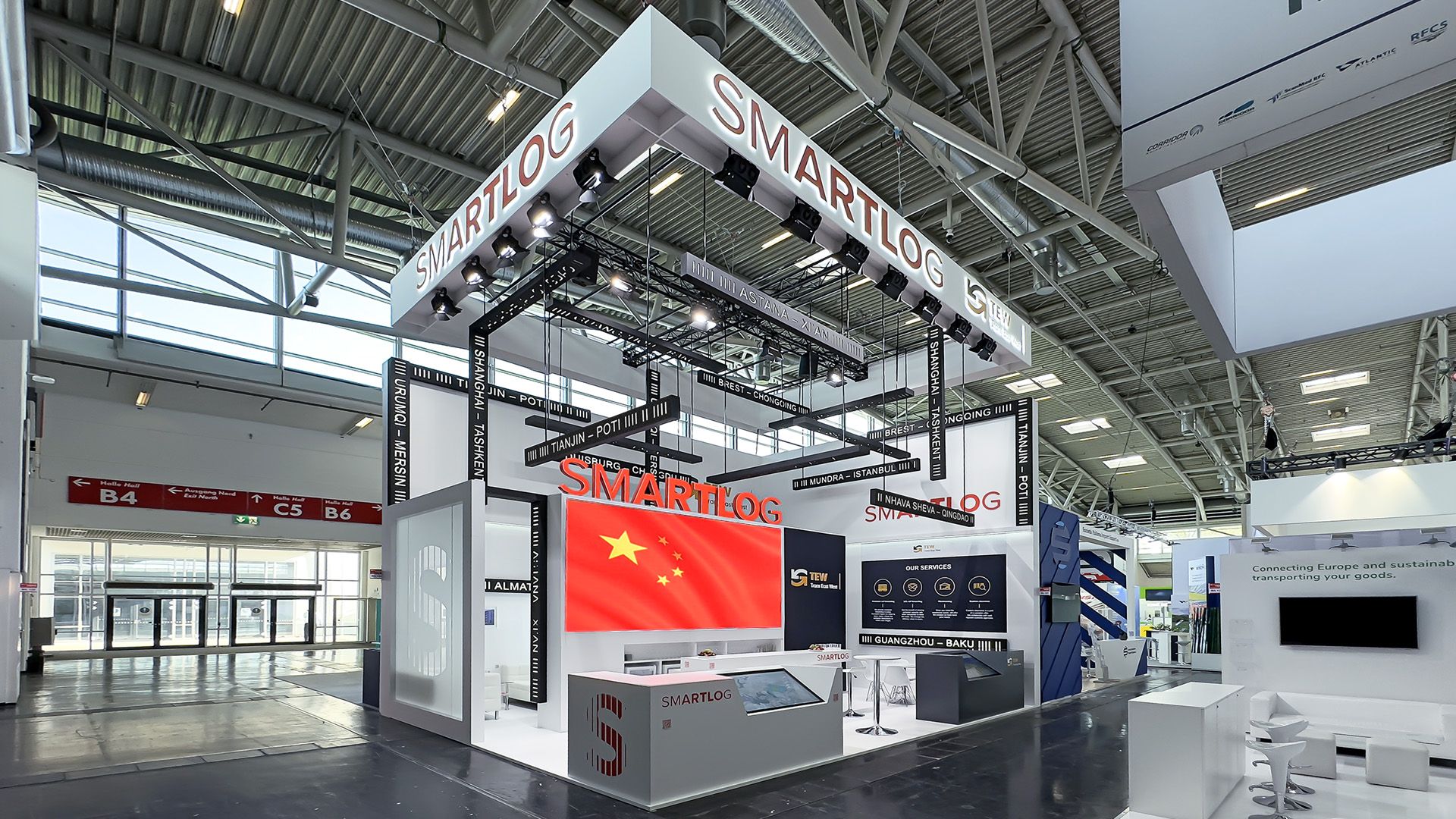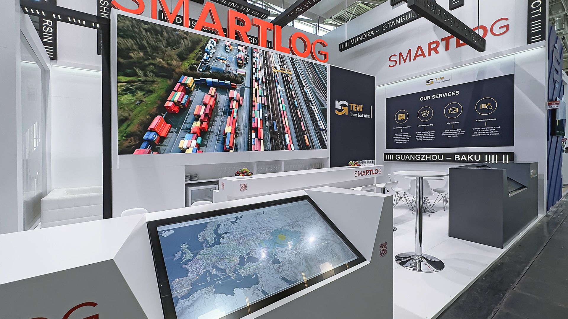 A sharp black-and-white design emphasizes precision and technology, while the brand’s signature colors serve as visual markers. The stand maintains a balance between stability and motion, demonstrating how SMARTLOG optimizes global logistics.