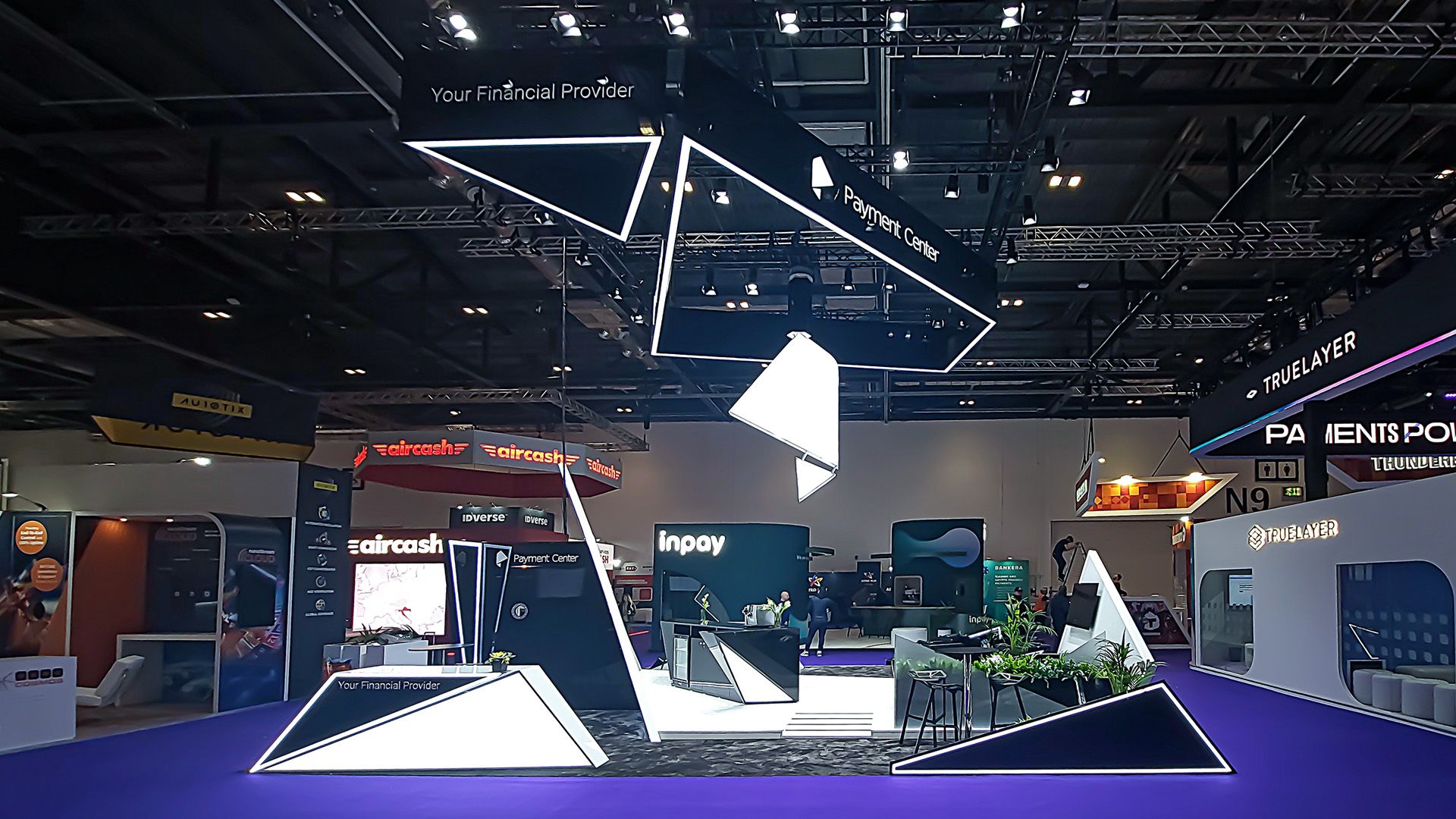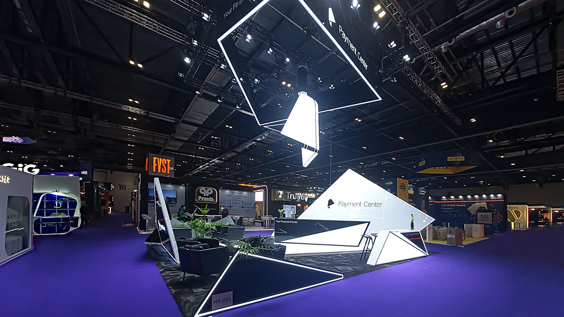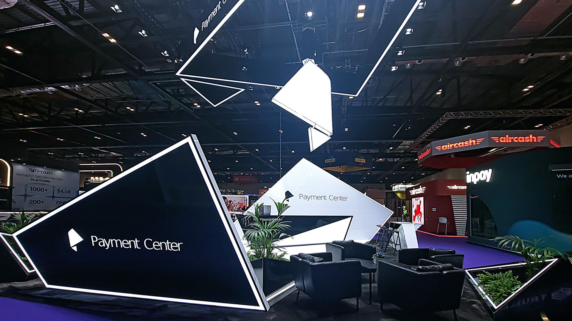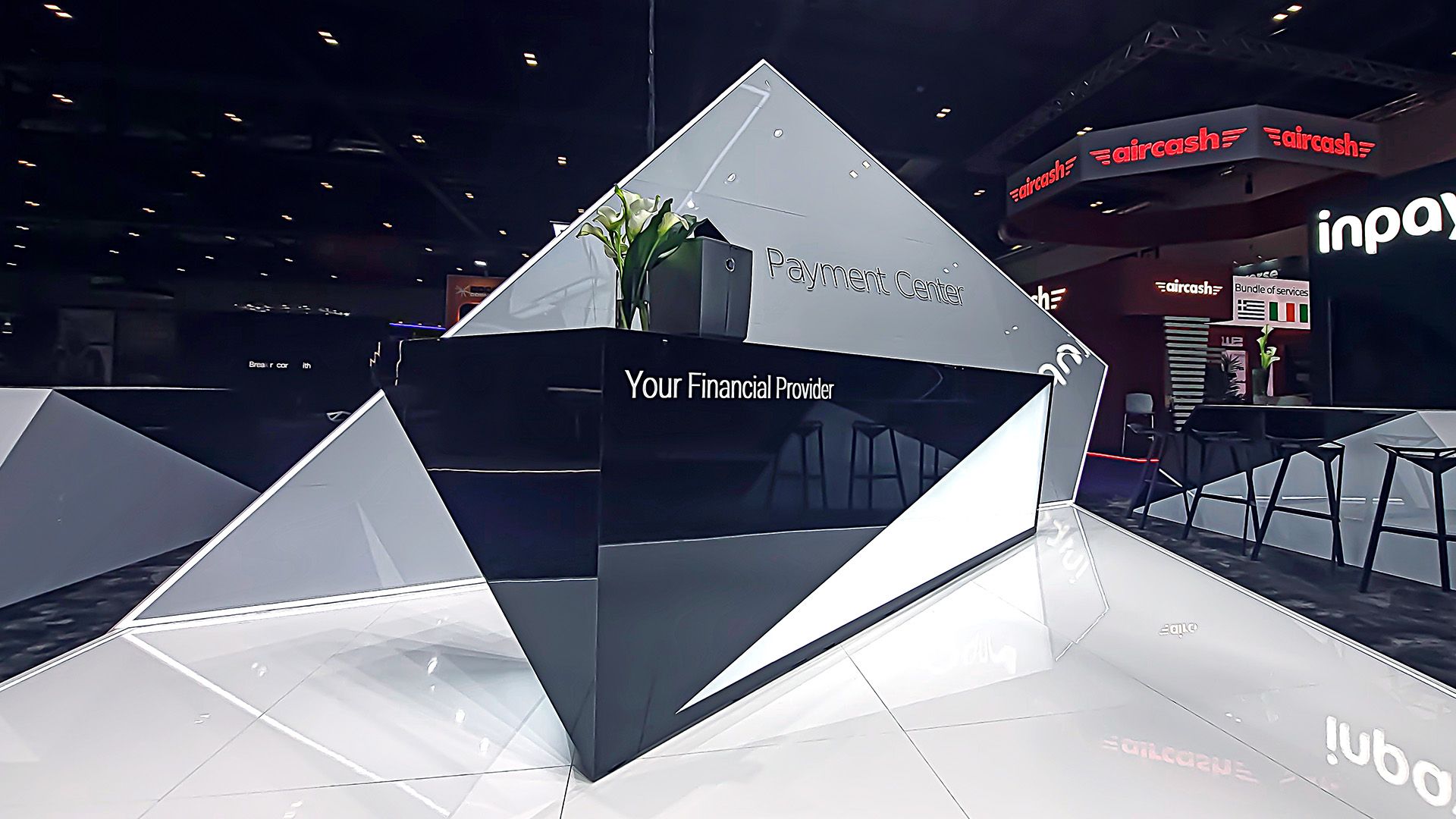 The architectural concept of the Payment Center stand is inspired by the company’s logo, which has been transformed from a 2D design into a striking 3D structure, resembling a folded banknote.