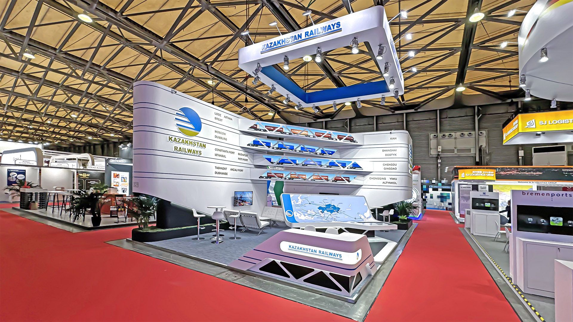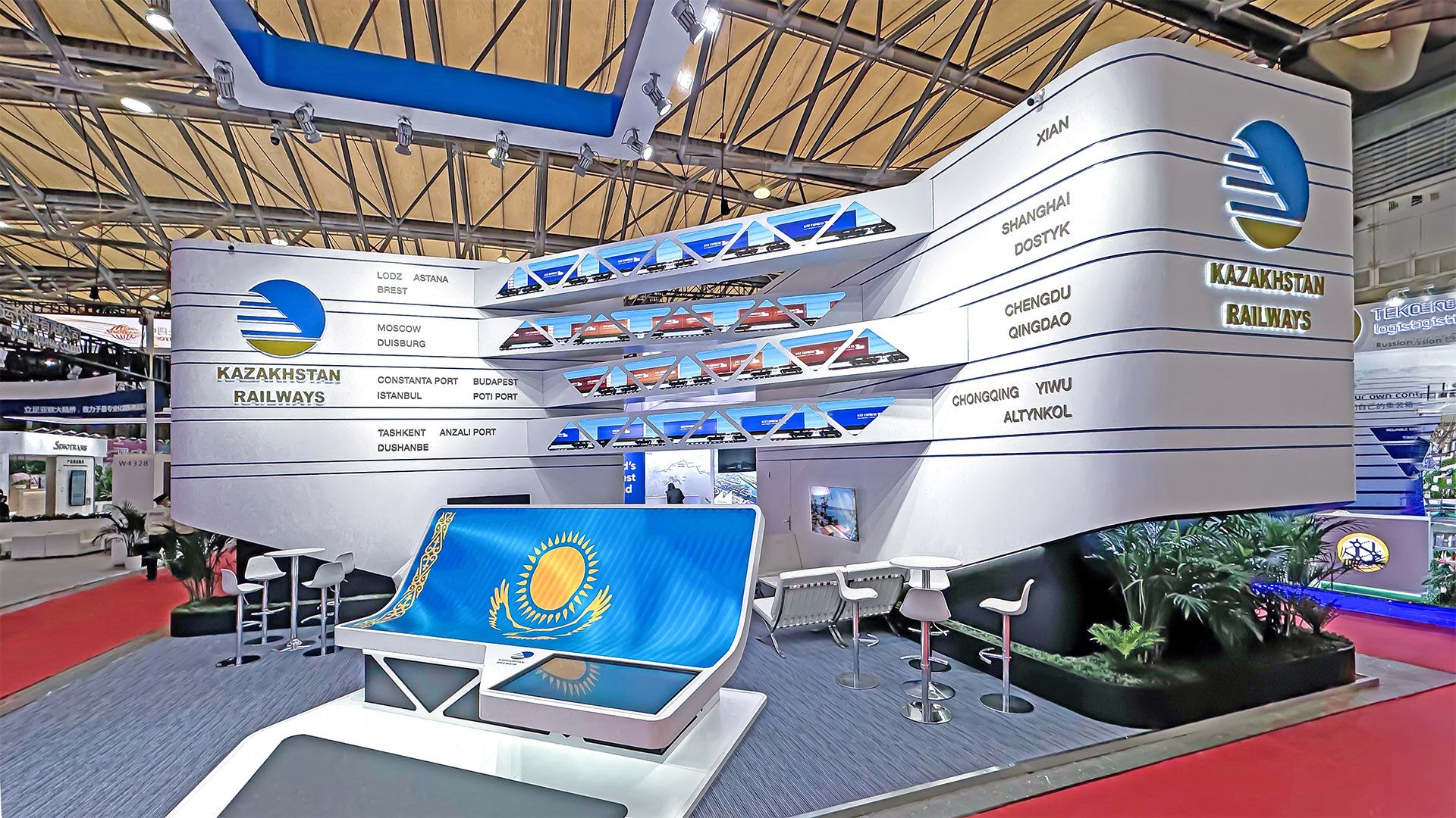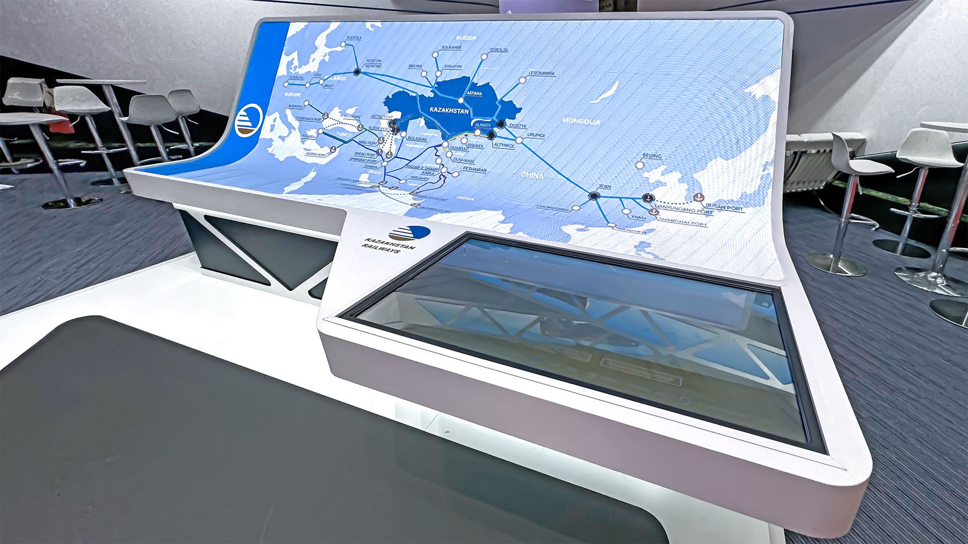 The Kazakhstan Railways exhibition stand highlights the country’s vital role in connecting East and West. Two large elements on the right and left symbolize the continents, seamlessly connected by railway routes, showcasing key cities and logistics hubs.