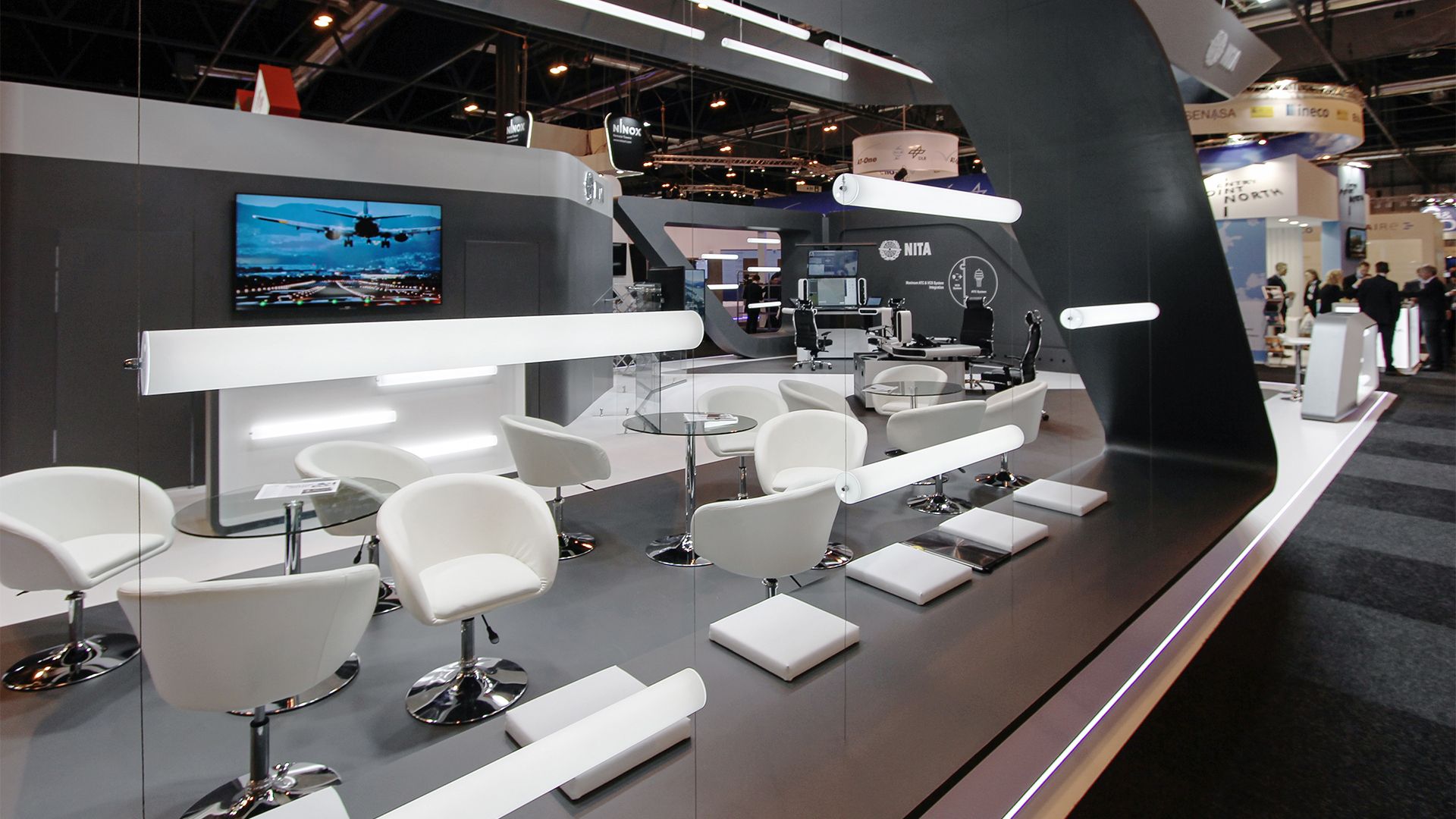The stand structure ingeniously incorporates exhibitor’s air traffic equipment, seamlessly blending functionality with modern aesthetics.