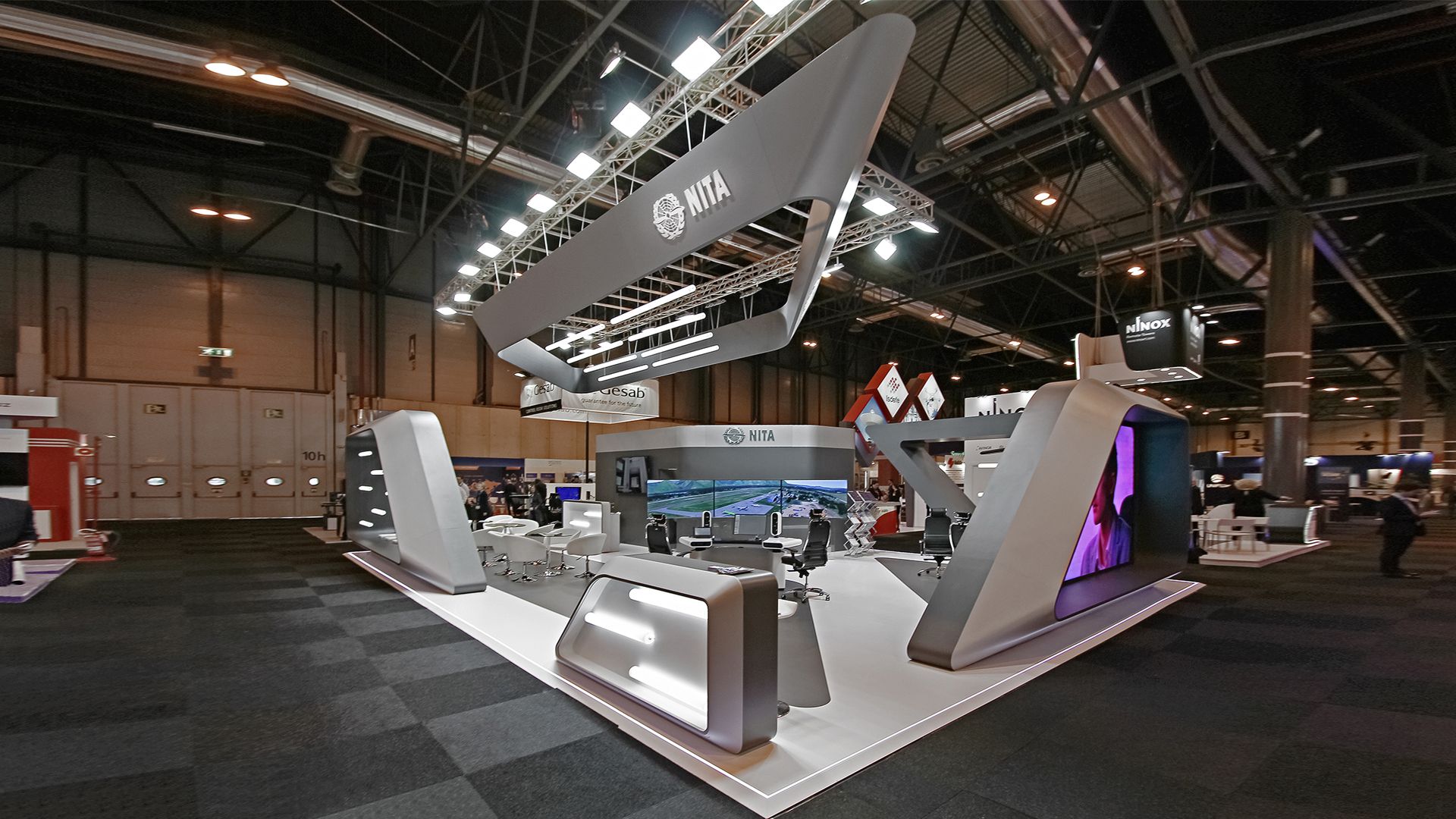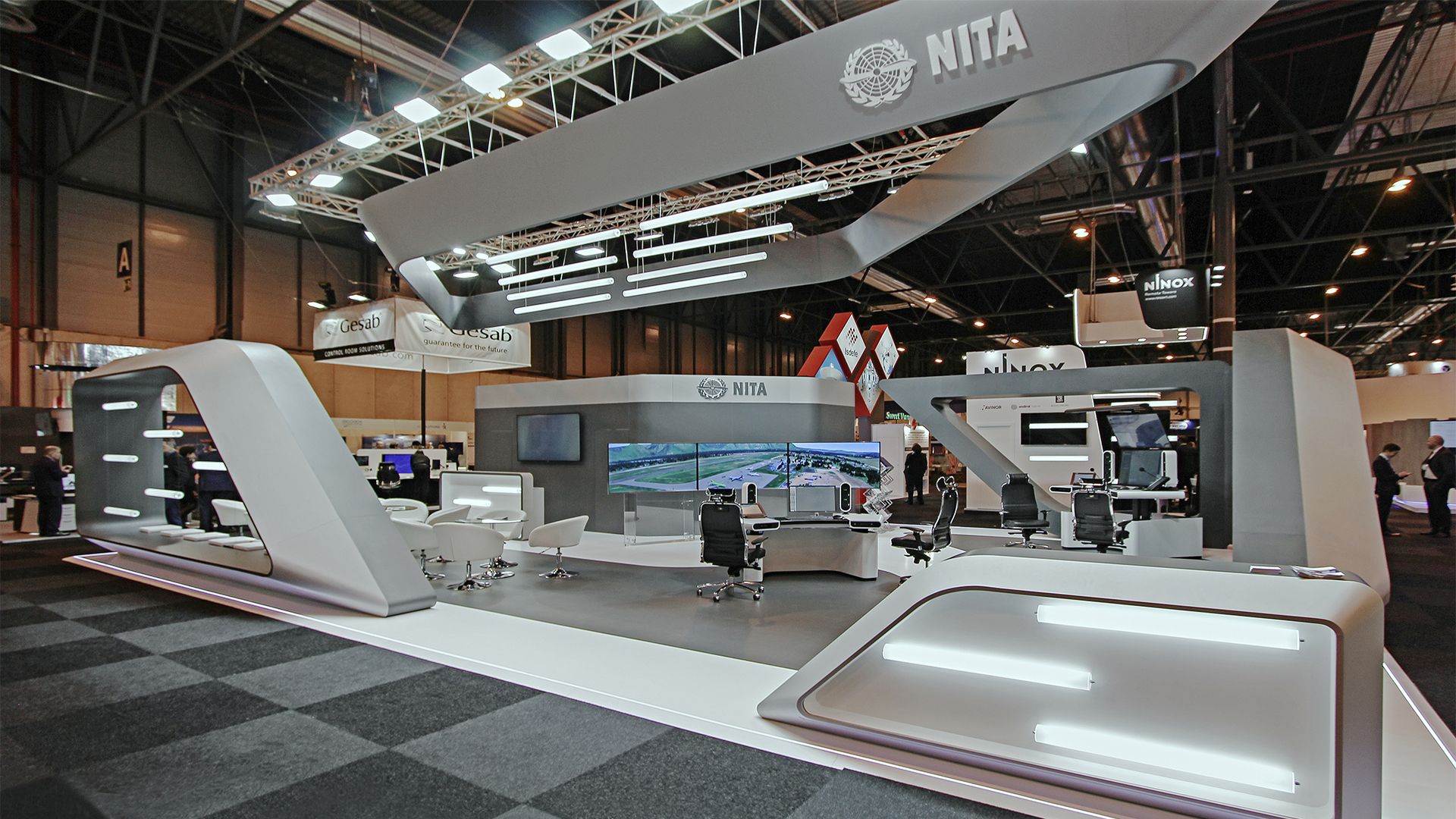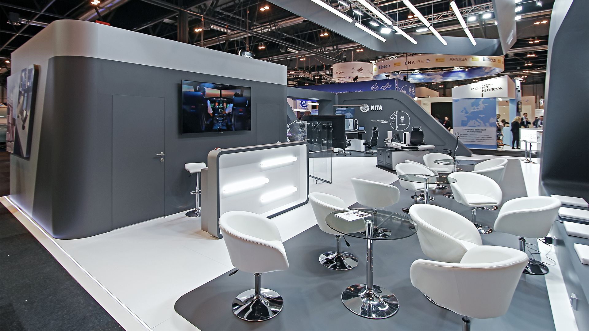 The stand structure ingeniously incorporates exhibitor’s air traffic equipment, seamlessly blending functionality with modern aesthetics.