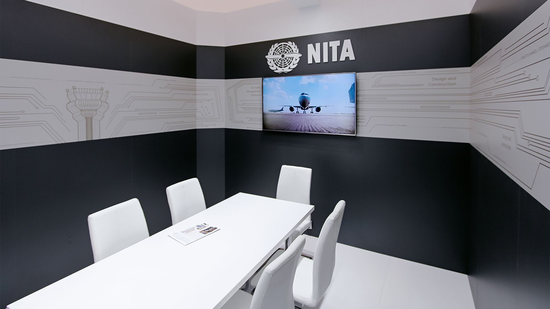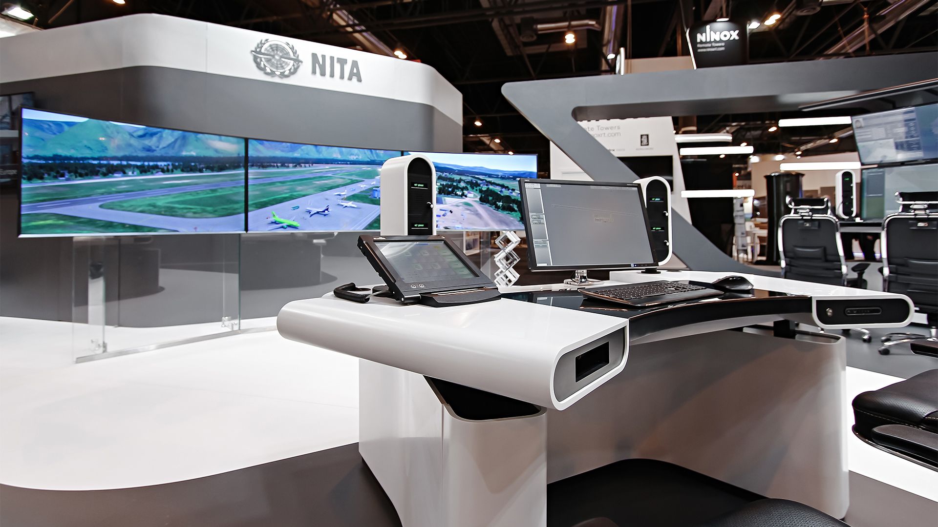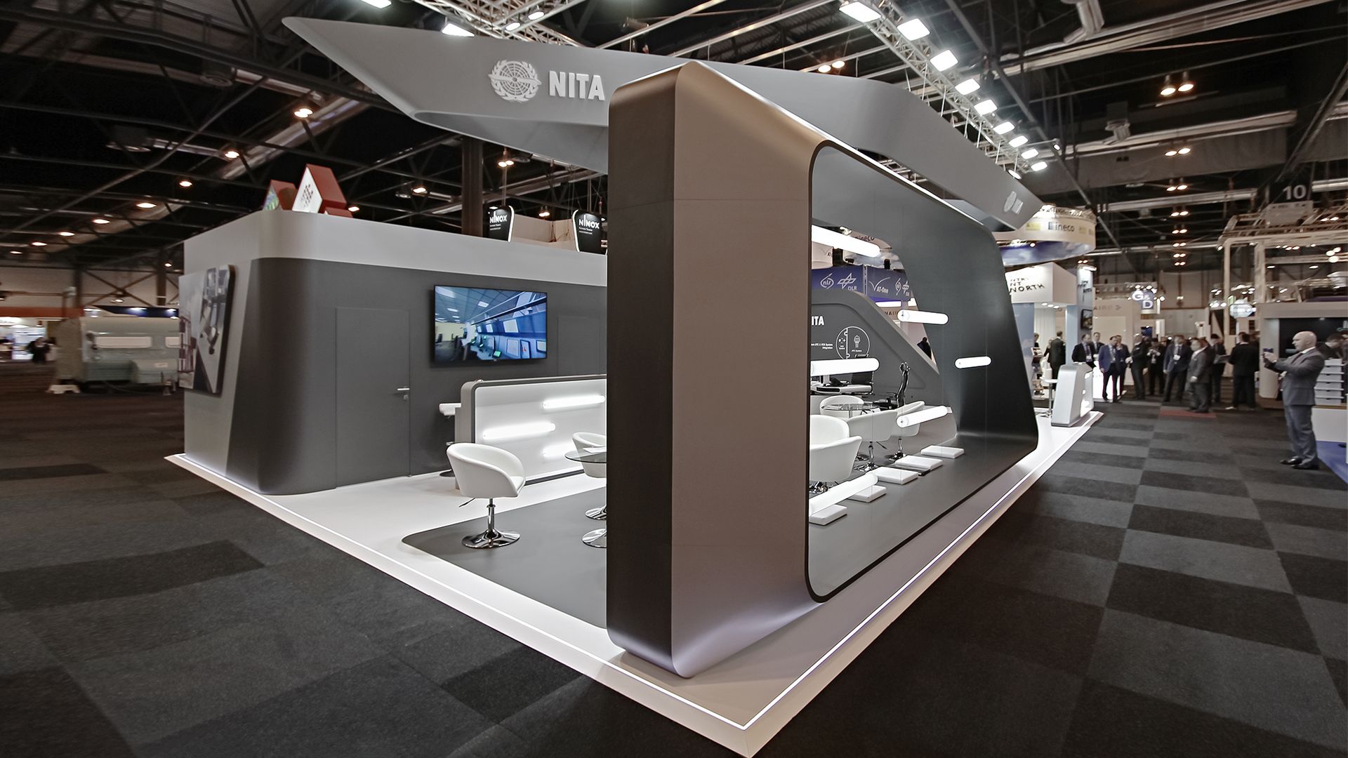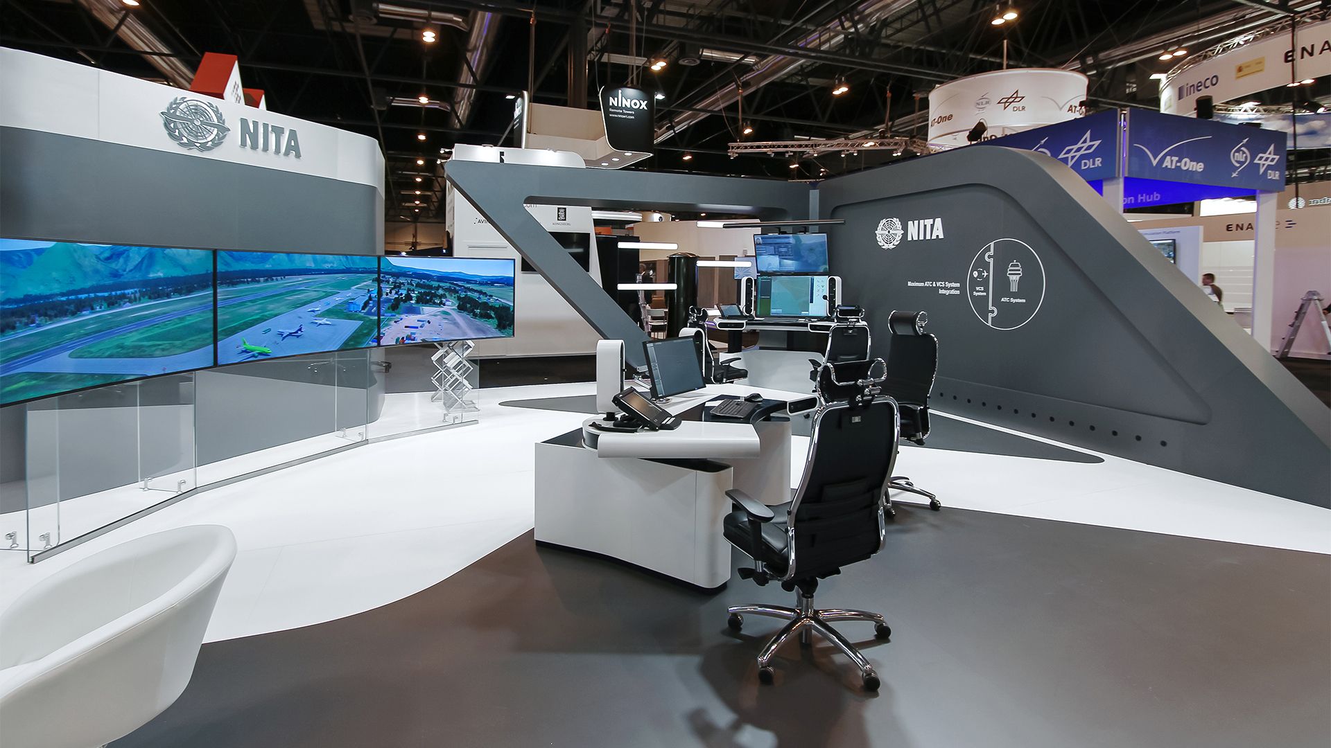 The stand structure ingeniously incorporates exhibitor’s air traffic equipment, seamlessly blending functionality with modern aesthetics.